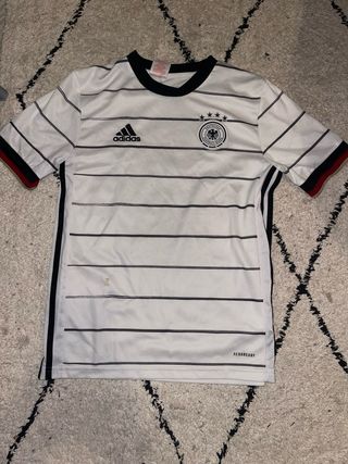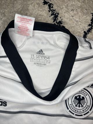 Maglia da calcio della Germania. - Colore bianco con strisce nere. - Logo Adidas. - Stemma della nazionale tedesca.