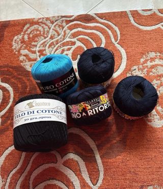 Lotto di 5 gomitoli di puro cotone, ideali per i tuoi progetti di maglia o uncinetto. - Colore: blu e nero. - Peso: 50 grammi circa per gomitolo.