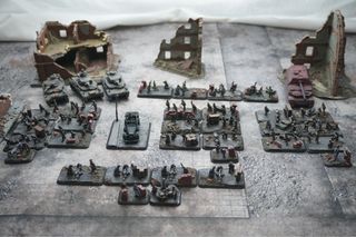 Set di miniature per wargame ambientato a Berlino durante la Seconda Guerra Mondiale. As per photos No split Houses/scenery NOT included - Scala 15mm. - Esercito tedesco. - Compatibile con Flames of War (FOW). - Include carri armati e fanteria.