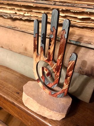 Mano di Hamsa in metallo smaltato con un design unico e colorato, montata su una base di pietra grezza. - Realizzata in metallo con smalto - Base in pietra naturale.