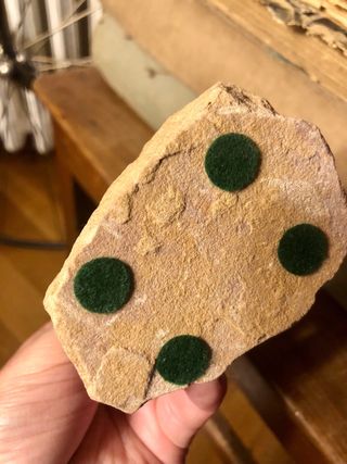 Lotto di scampoli di pannolenci in vari colori e due gomitoli di lana. - Scampoli di pannolenci: bianco, verde a pois bianchi, bordeaux, arancione. - Gomitoli di lana: uno bianco e uno rosso.