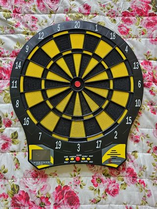 Bersaglio elettronico per freccette, usato poche volte, in ottimo stato. Giocabile fino ad 8 giocatori La scatola comprende il tabellone, 3 freccette e 4 ricambi per le punte. L'unico difetto è la scatola che risulta essere leggermente rovinata