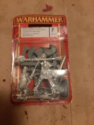 Modellino di stregone dell'Impero Warhammer Fantasy, fuori produzione metallo (OOP). Adatto per essere montato a cavallo o a piedi. Scatola originale.
