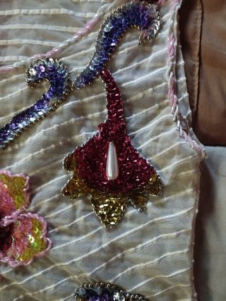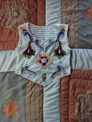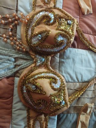 Splendido corpetto per danza orientale in poliestere, impreziosito da curati ricami, misura dal collo al ventre 37 cm, da spalla a spalla 30 cm e sottoseno 34 cm ( è una tg xs)