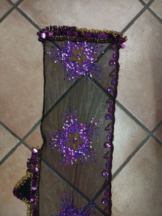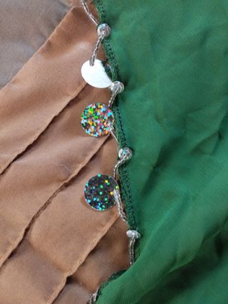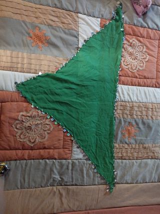 triangolo per farne un copricapo nella danza orientale, di poliestere in un bel verde brillante, ornato di paillettes iridescenti e perline. misura 60 cm in lunghezza e 116 cm in lunghezza