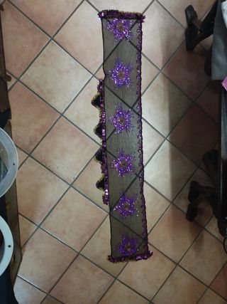 due fusciacche di tessuto, una verde e una arancione, con ricamo di perline misurano in lunghezza 140 cm