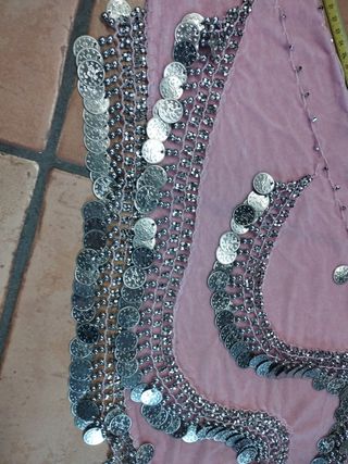 Fusciacca e corpetto per danza orientale, in morbido velluto rosa , impreziosita da un ricamo ondulante di perline e monete argentate, misura in lunghezza 143 cm la cintura e 140 cm il corpetto