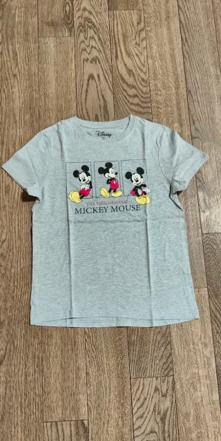 Usata in ottime condizioni. T-shirt girocollo, tinta unita di colore grigio, TG. XS da ragazza con stampa frontale che raffigura il celebre personaggio "Topolino" della Disney e tessuto 100% cotone.