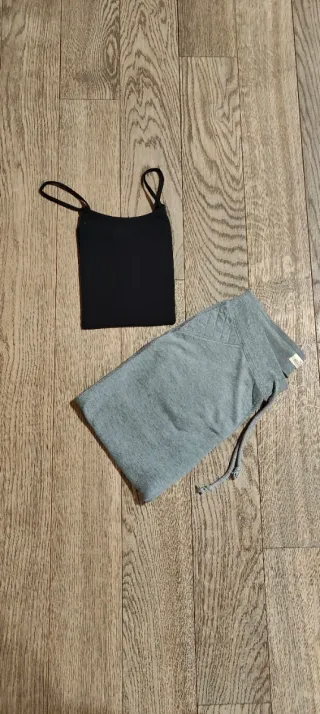 Usato in ottime condizioni. Set sportivo TG. S da ragazza che comprende: - una canottiera sportiva, tinta unita di colore nero TG. S/M con tessuto 92% poliammide e 8% elastan; - pantaloni della tuta, tinta unita di colore grigio, TG. S con elastico in vita, polsini sulle caviglie, interno felpato e tessuto 56% cotone, 38% poliestere e 6% elastan.