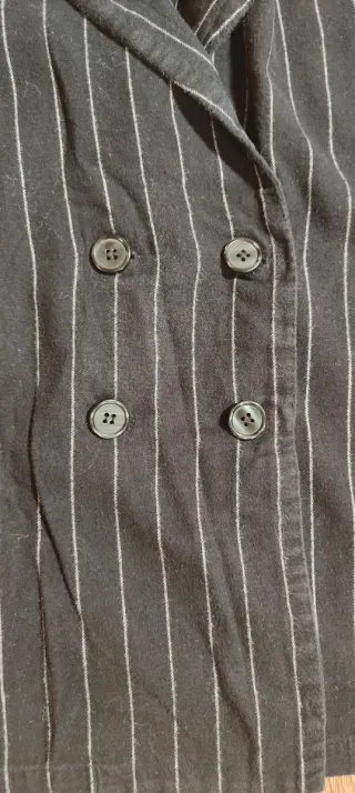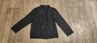 Usato in ottime condizioni. Blazer gessato corto, TG. M da ragazza con righe bianche su sfondo a tinta unita di colore nero, chiusura a doppio petto e tessuto 100% cotone. MISURE: spalle 38 cm, da ascella a ascella 52 cm, lunghezza manica 53 cm e lunghezza 58 cm.