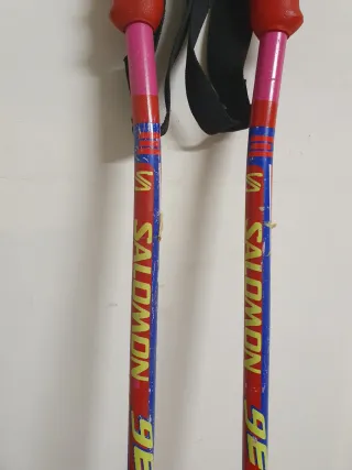 Coppia di bastoncini da sci Salomon.Altezza cm.105 - Colore rosso e giallo. - Impugnatura nera ergonomica. - Laccetti neri regolabili.