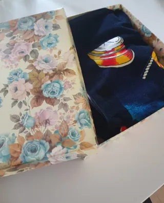 Telo mare con una bellissima scatola decorata con fiori. - Telo mare blu con disegno cm. 180x 100 - Scatola con motivo floreale colorato cm.40x40