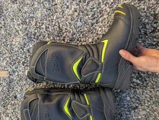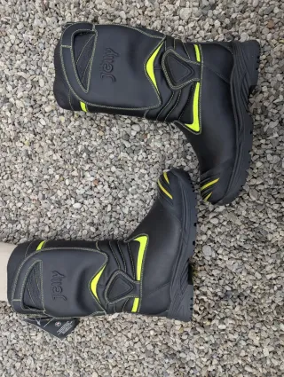 Stivali Jolly in pelle nera con dettagli gialli. -Antincendio .. - Logo Jolly inciso sul lato. - Cuciture a contrasto gialle. - Inserti protettivi. - Suola in gomma resistente.