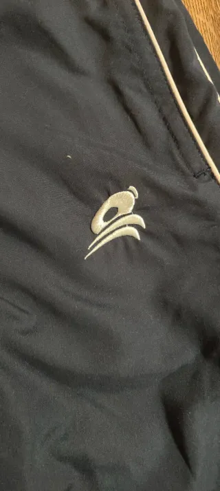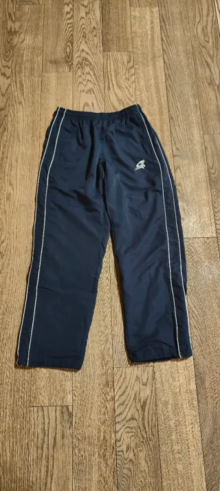 Usati in ottime condizioni. Pantaloni della tuta, tinta unita di colore blu, TG. S da ragazzo con elastico in vita, polsini sulle caviglie, tasche laterali con chiusura a zip, toppe decorative frontali e tessuto 100% poliestere. MISURE: vita 37 cm ma regolabile, fianchi 47 cm e lunghezza 99 cm.