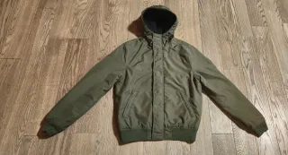 Usato in ottime condizioni. Giubbotto, tinta unita di colore verde, TG. S da ragazzo con cappuccio, doppia chiusura frontale (sia a zip sia a bottoni), tasche frontali con chiusura a zip, polsini sulle maniche, tessuto esterno 100% poliestere e fodera 100% cotone. MISURE: spalle 46 cm, da ascella a ascella 54 cm e lunghezza 63 cm.