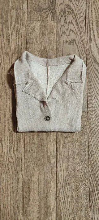 Usato in ottime condizioni. Cardigan corto tinta unita di colore beige, TG. S da ragazza con chiusura frontale a bottoncini, decorazioni a perline applicate sulla parte frontale e tessuto 40% viscosa, 28% poliestere e 32% nylon.