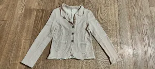 Usato in ottime condizioni. Blazer sfiancato, corto, tinta unita di colore beige; TG. M da ragazza con chiusura frontale a bottoni, tasche frontali e tessuto 95% cotone e 5% elastan. MISURE: spalle 39 cm, da ascella a ascella 41 cm e lunghezza 53 cm.