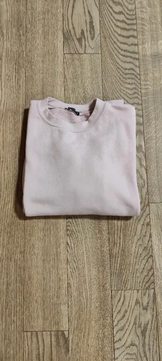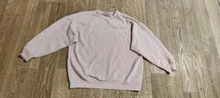 Usata in ottime condizioni. Felpa girocollo modello "over size", interno felpato, tinta unita di colore rosa antico, TG. M da ragazzo con polsini sull' estremità delle maniche ed elastico in vita. MISURE: spalle 65 cm, da ascella a ascella 64 cm e lunghezza 67 cm.