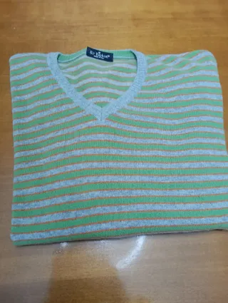 Maglioncino a righe per bambino. - Girocollo a V - Fantasia a righe blu, bianche e nere - Logo ricamato sul petto (4) altezza 60 spalle 40 circonferenza torace 98 maniche 58 . nessun difetto