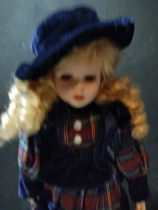 Deliziosa bambola in porcellana, con un'elegante mise Vittoriana. Dimensioni:44 cm - Abito a quadri con dettagli in velluto blu. - Cappello abbinato. - Capelli biondi ricci.