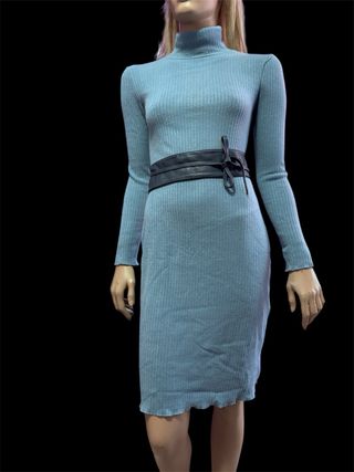 Favoloso abito in morbidissima maglia viscosa ed elastam di Fracomina. Lavorazioni a costine, maniche lunghe e collo alto. Color azzurro polvere. L'abito si può portare con o senza cintura (la cintura delle foto è esclusa). Tg L vestibilità slim. Mai indossato. Perfetto.