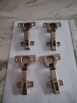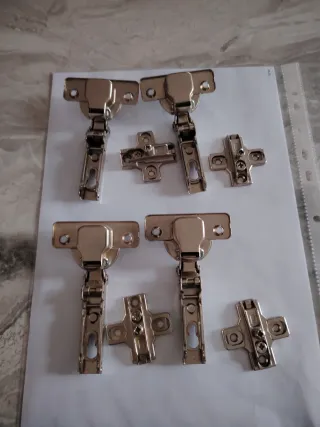Set di cerniere per ante di mobili, complete di basetta regolabile. - Materiale: metallo lucido. - Design moderno e funzionale.