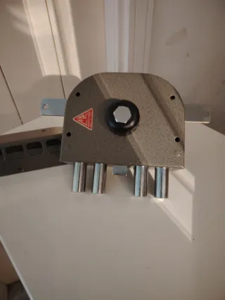 Serratura di sicurezza per porte interne. Realizzata in metallo grigio con finitura testurizzata. - Meccanismo a cilindro. - Perni di chiusura in metallo lucido. - Piastra di fissaggio in metallo. - Logo del produttore visibile.