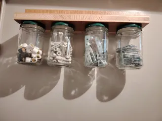 Set di contenitori trasparenti ideali per organizzare la ferramenta e le minuterie. - Realizzati in vetro trasparente. - Coperchi verdi ermetici. - Perfetti per viti, bulloni, tasselli e altri piccoli oggetti.