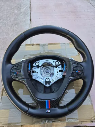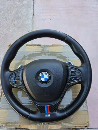 Volante sportivo per BMW X3 con finiture in carbon look e inserti M. - Logo BMW al centro. - Inserti tricolore M. - Pulsanti multifunzione.