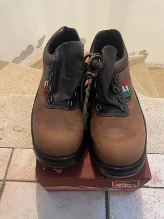 Scarpe antinfortunistiche marca LEWER in pelle marrone. - Tomaia in pelle. - Inserti in pelle nera. - Lacci neri. - Suola nera.