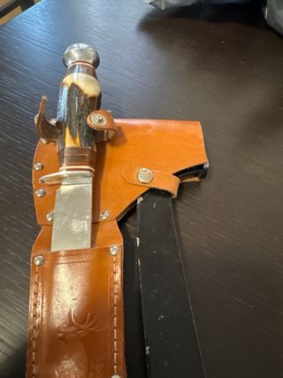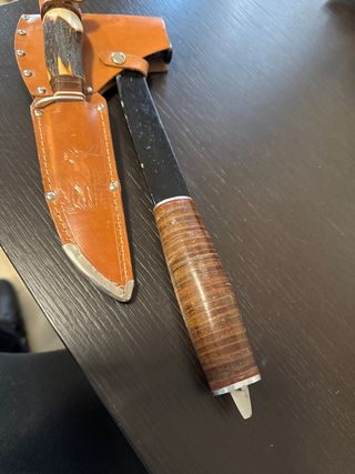 Set vintage composto da un'ascia e un coltello, risalenti agli anni '70. Entrambi gli strumenti presentano manici in pelle stratificata e sono corredati da un fodero in cuoio. coltello come nuovo - Fodero in cuoio con incisioni. - Manici in pelle stratificata. boy scout