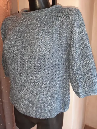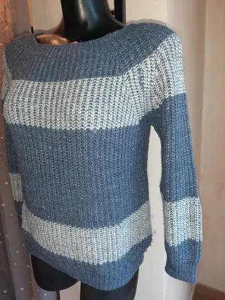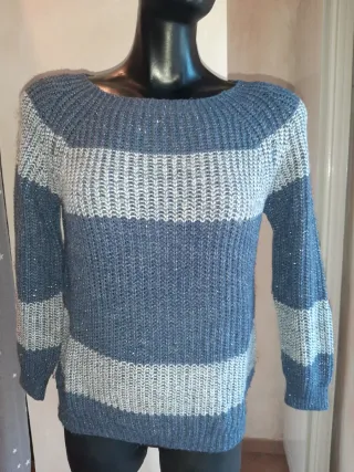 Bel maglione da donna blu e grigio con un filato scintillante color argento, brilla ma le foto non gli rendono giustizia, brand Facit, purtroppo ho rimosso l'etichetta, è sicuramente in misto lana, calda e morbida adatta per l'inverno, indossata un paio di volte, non presenta difetti, taglia S/M misure in foto. #maglionedonnarighe #maglionedonnafacit #maglionebrillante #maglionebluegrigio #blackfriday #cybermonday - Girocollo. - Maniche lunghe. - Tessuto morbido con fili scintillanti.