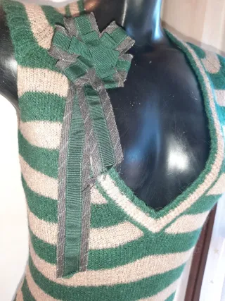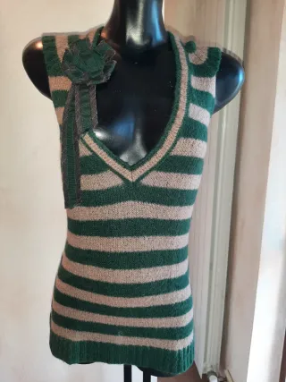 Bellissimo gilet lungo donna a righe di colore verde bosco e beige, con spilla corrarda removibile, vintage primi anni 90. Brand Peg, misto lana caldo e morbido (non ha più l'etichetta della composizione) taglia seconda che corrisponde a una S ulteriori misure in foto. Indossato una volta, nessun difetto in perfette condizioni. #giletvintage #giletdonnavintage #giletrighedonna #giletrigheinmaglia #vintageanni90 #blackfriday #cibermonday