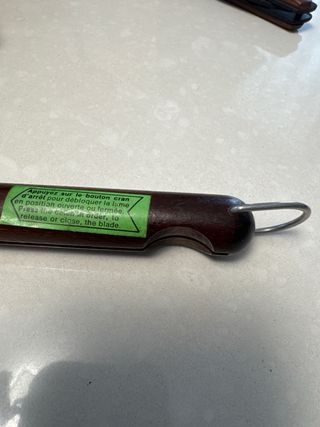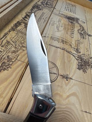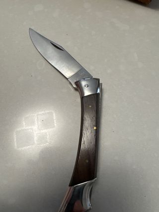 Coltello pieghevole vintage risalente agli anni '80. - Lama in acciaio inossidabile. - Manico in legno scuro con inserti. - Meccanismo di chiusura funzionante.