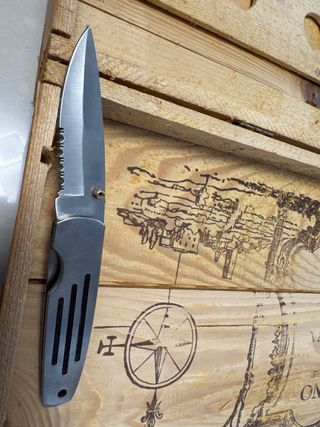 Coltello da collezione in metallo. - Lama in acciaio. - Manico con inserti neri. apertura a una mano