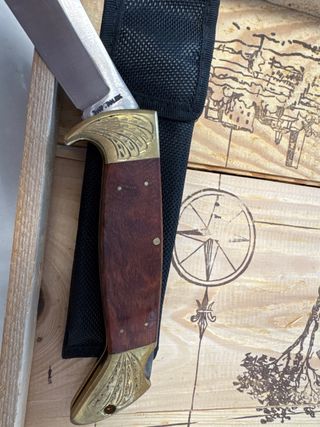 Coltello da collezione con manico in legno e dettagli in ottone. - Lama in inox SHARP STAINLESS. - Manico in legno scuro. - Dettagli decorativi in ottone a forma di aquila. - Include fodero sportivo in tessuto nero.