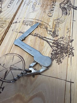 Coltellino multiuso di fabbricazione tedesca risalente agli anni '70. Un pezzo da collezione con diversi strumenti. - Lama principale in acciaio. - Apribottiglie. - Cavatappi. - Piccolo coltello ausiliario.