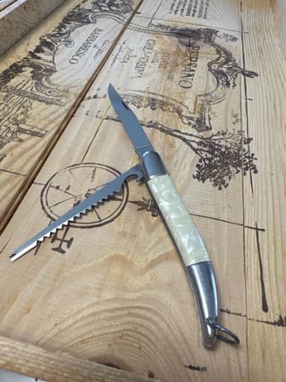 Coltellino multiuso da collezione con manico bianco - Lama principale in acciaio. - Sega. - Apribottiglie/apriscatole.