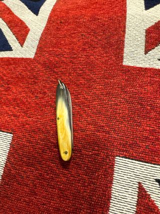 Coltellino vintage risalente agli anni '60. L'impugnatura presenta una sfumatura di colore tra il giallo e il nero. - Manico in materiale pregiato. - Due rivetti visibili sull'impugnatura. in corno