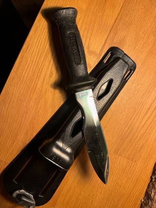Coltello subacqueo con fodero. - Impugnatura antiscivolo. - Lama in acciaio. - Fodero in plastica nera.