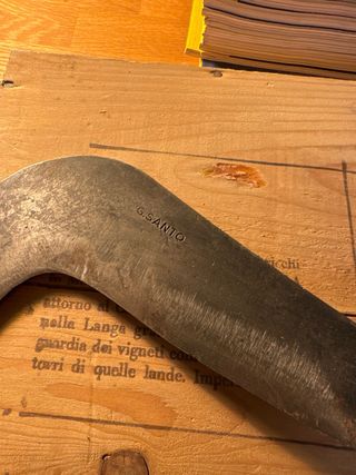 Attrezzo da taglio con lama curva e manico in legno. - Lama in metallo con incisione G.SANTO. - Manico in legno avvolto. - Presenta un gancio metallico alla base.