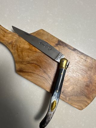 Coltello pieghevole Laguiole forgiato, un pezzo classico e funzionale. mai usato perfetto per regalo - Lama in metallo affilata. - Manico in corno con inserti dorati. - Lunghezza lama: 12 cm.