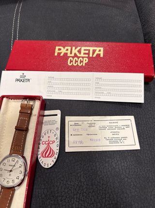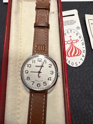 Orologio da polso Raketa con cinturino in pelle marrone. - Quadrante bianco con numeri arabi. - Logo CCCP sul cinturino. - Scritta СДЕЛАНО В СССР sul quadrante.