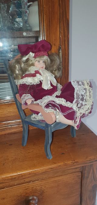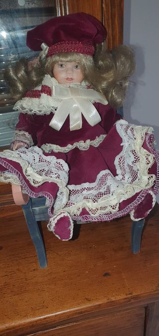 bambola in porcellana con vestito in velluto rosse e pizzo completa di seduta in legno