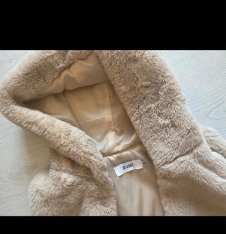 Mai utilizzata, con cappuccio, tasche, clip sul collo per abbottonarla e cintura di pelle in vita. Lunga fino al ginocchio Gilet in morbida pelliccia sintetica color beige, con cintura in raso nero. - Design senza maniche. - Cintura in raso nero per definire la silhouette. - Materiale effetto pelliccia