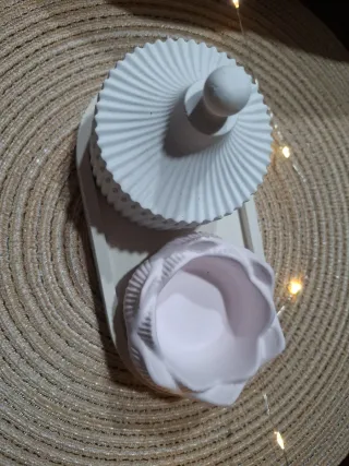 Elegante set decorativo realizzato in gesso ceramico. - Base ovale. - Contenitore rotondo con coperchio e pomello. - Piccolo contenitore a forma di fiore.