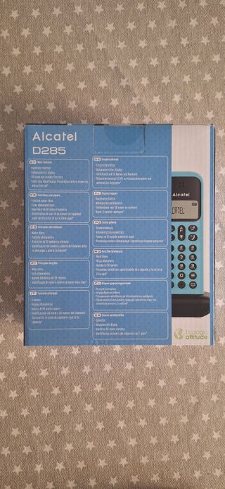 Telefono cordless Alcatel D285 in color turchese. Design moderno ed elegante. Schermo chiaro per una facile visualizzazione. Base di ricarica compatta. Base di ricarica inclusa. Schermo retroilluminato. Tastiera numerica con tasti di accesso rapido. Senza aprire.