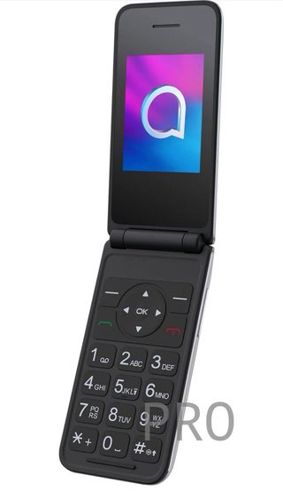 Telefono mobile Alcatel in colore nero. Un dispositivo semplice e funzionale. Design classico, tastiera numerica completa, tasti grandi, pulsante SOS, con caricatore e base. Ideale per gli anziani.