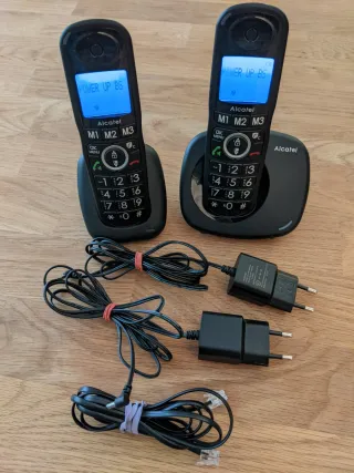 Coppia di telefoni cordless. Principale e secondario per posizionarli in due luoghi diversi della casa o dove preferisci. Funzioni di sveglia, agenda, elenco delle ultime chiamate, ecc... Marca: Alcatel Colore: Nero