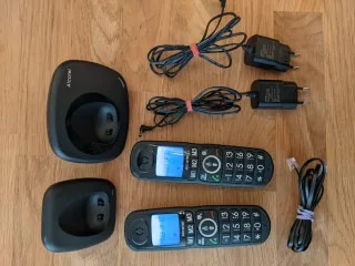 Set di due telefoni senza fili, con pochissimo utilizzo. Include due basi di ricarica e due adattatori di corrente.